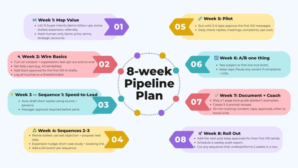 An 8-week, human centered plan to build governed AI sales playbooks in HubSpot, Salesforce, or Dynamics, so Sales Directors and GTM strategists can grow a pipeline with realistic, measurable targets and a calmer team.